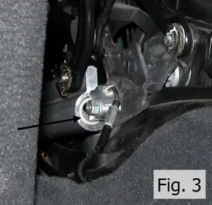 - Reaching under the retracted deck, remove the rear top anchoring cable ends by prying the connectors away with a suitable prying tool. If you are strong enough, the connectors can be removed by hand. There are two of them, one on each side. Right side shown in Fig. 2.