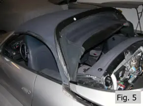 - Fold the rear of the top forward by lifting up the back edge and pushing forward. The top should stay in this position on its own, as shown in Fig. 5 of the Hydraulic Cylinder Removal instructions. Note: for 2002 and later cars with rear glass window, the back edge of the top will need to be propped up.