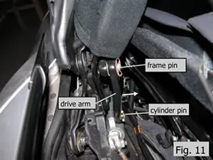 - Remove the clips from the cylinder drive pin and frame pin as shown in Fig. 11 and 12 and remove the left and right drive arm. Pry the tab on the clip until it clears the end of the pin, and slide the clip off by pushing in the direction show by the arrow. Be careful not to drop the clip, as it may be difficult to retrieve. Slide the drive arm off the pins as show by the arrow. If there is some resistance, grab the side of the top and pull it backwards slightly. This will relieve the side force on the pins.