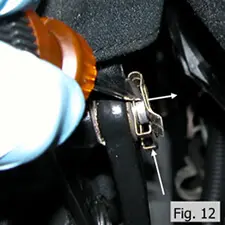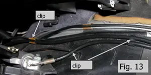 - Gently pull up on the hydraulic lines to remove them from the hold-down clips. Do not bend the lines excessively, as this may cause damage to the lines. The left side is shown in Fig. 13. The right side is similar.