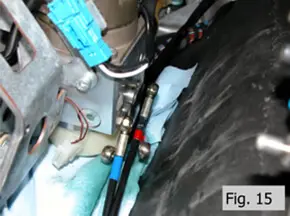 - Place several layers of shop towels under the pump and unscrew the two banjo bolts using a 12mm socket. Some hydraulic fluid will drain out and absorb into the shop towels. Note the position of the copper seals and the blue and red banjo connectors, Fig. 14. Place the bolts and washers in a clean parts tray. Fig. 15 shows the loose banjo connectors. At this point, wrap the banjo connector ends with shop towels or cover with plastic baggies to keep them clean and to prevent hydraulic fluid leakage during cylinder removal.
