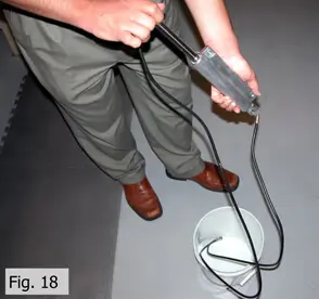 - Place the hydraulic line ends into a clean bucket as shown in Fig. 18. While holding the cylinder housing firmly in one hand, push and pull the shaft from end to end several times with the other hand. This action will pump most of the fluid from the cylinder.